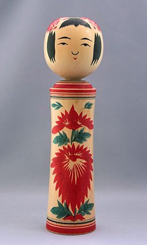 鳴子系の産地は、宮城県鳴子温泉。頭を胴体が別々の「はめ込み型」で、首を回すと「キュッキュッ」と音が鳴ります。胴体は太めで、中央がへこんだ指なりの形状になっています。菊やカエデ、なでしこなどの柄の華やかな着物が美しいこけしです。