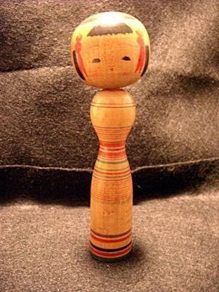 弥治郎系の産地は宮城県白石市弥治郎、鎌先温泉。頭部は「差し込み式」の構造で、頭頂部にはカラフルなろくろが何重にも書かれているのが特徴的なこけしですね。胴体はくびれがあったりストレートだったり様々で、色合いも華やかな印象になっています。